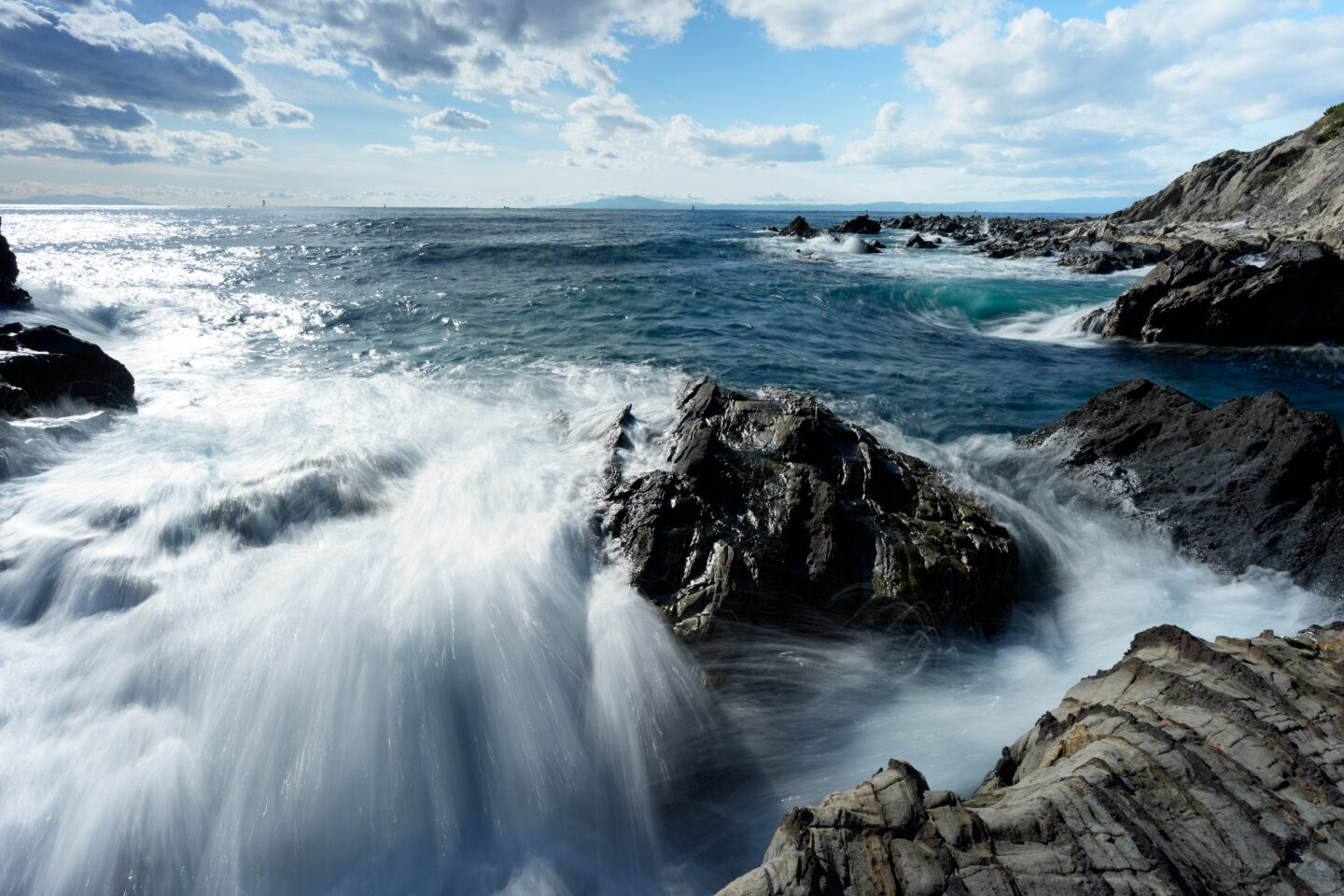 波は常に動いているだけにシャッターを切るタイミングが作品の良し悪しに直結します。決まった動きをするわけではないのですが、同じような動きを繰り返すのである程度の予測をつけることができます。チャンスが来そうだと思ったら狙ってシャッターを切り始め、2枚目以降は連写を活用するのも一つの手です。上の写真では左側の大きな波に加えて右側からも波が回りこんでいますね。対して下の写真は右側に波が無く迫力に欠けます。