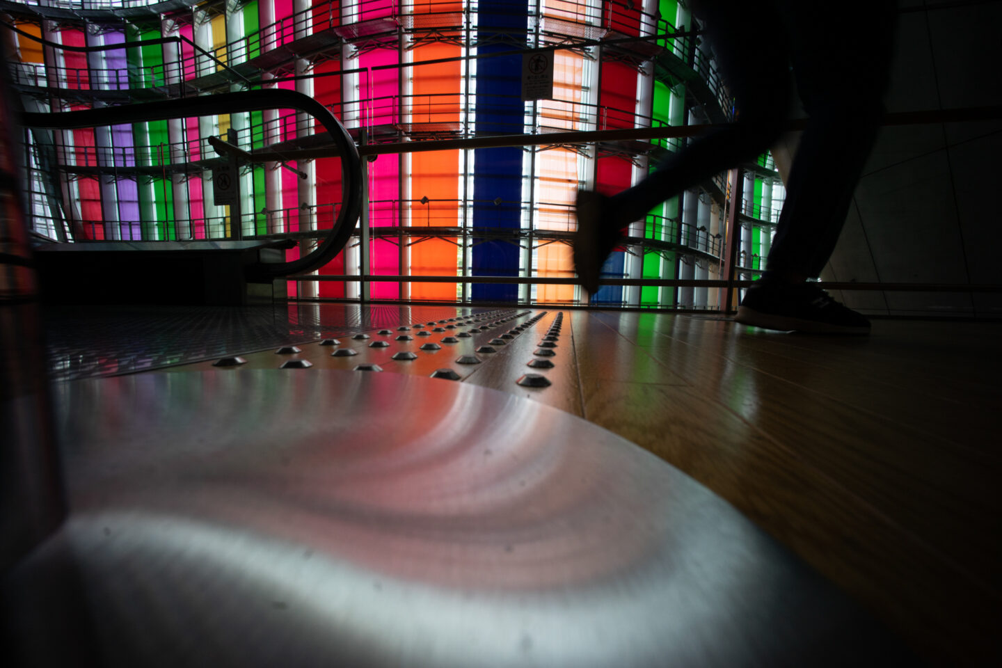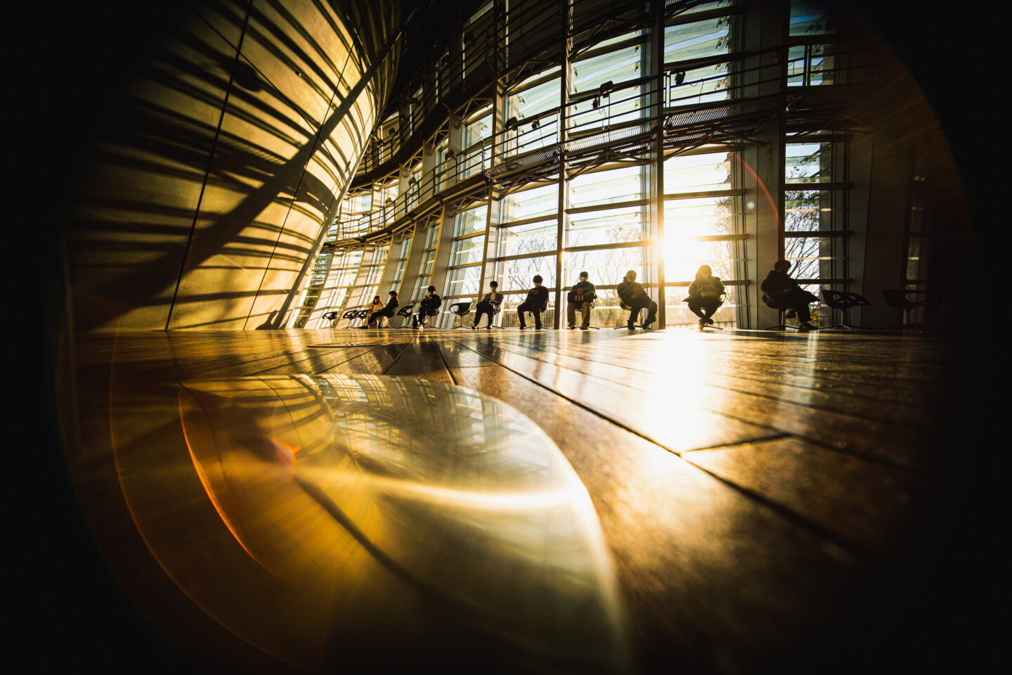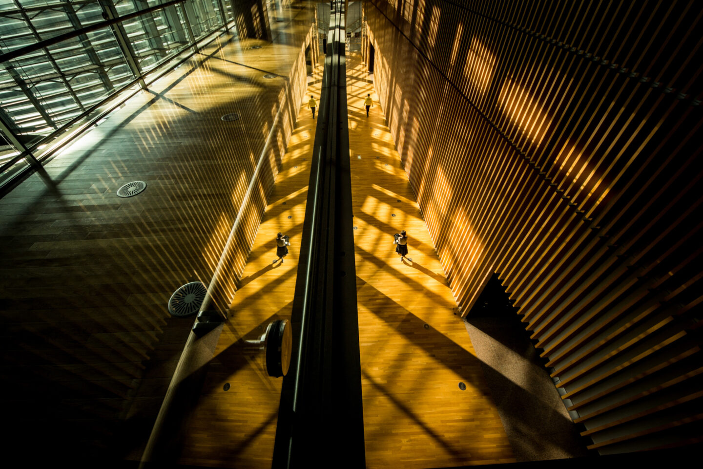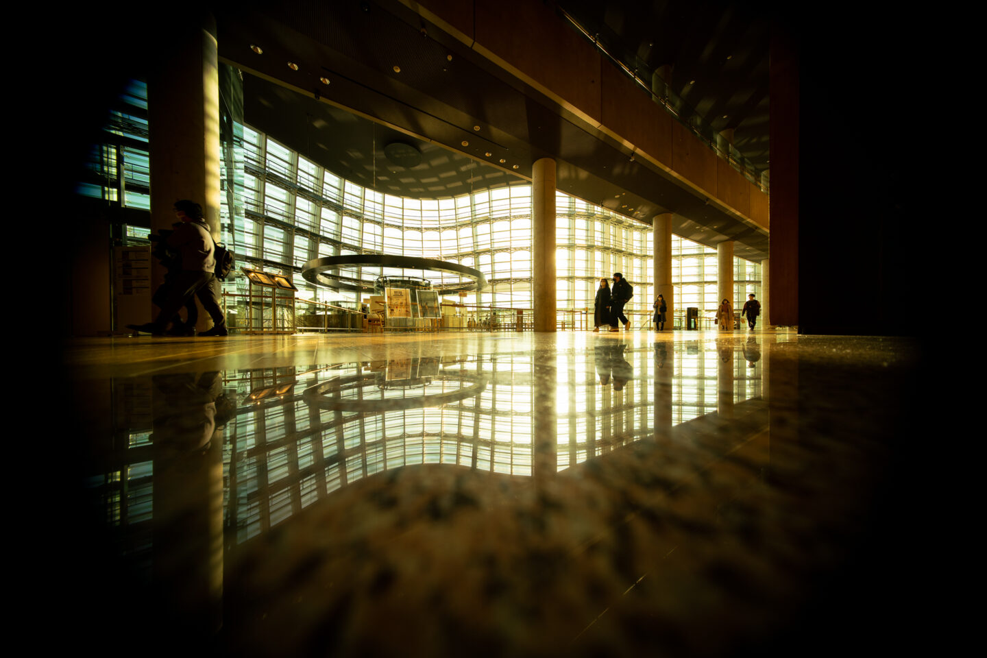 ここも昔から撮っていた場所だが、この構図は前回に行ってやっと見つけた。夕焼けで窓の光がMAXだと特に反射が綺麗になる。床は大部分が木なのでここまで綺麗な反射は難しいが、脇の通路に大理石の床があってそこに超広角レンズを直置きで撮っている。真ん中の円が二つ写っているところがお気に入り。