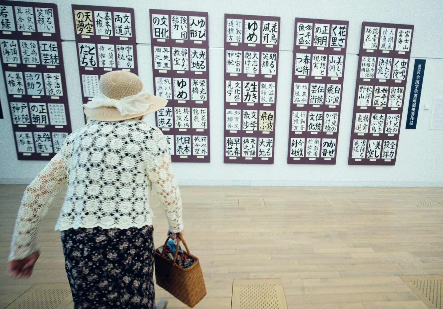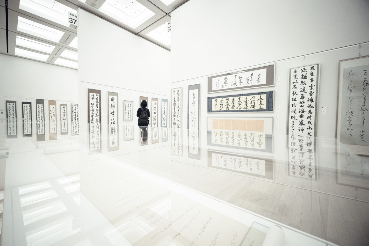 普段、展示会場は有料で基本撮影禁止な事が多いが、書道展は無料で撮影も大丈夫な事が多いのでお勧め。大きな沢山の文字の中にぽつりと一人。好きな情景だ。ガラスのケースもあったのでその反射を使ってみた。