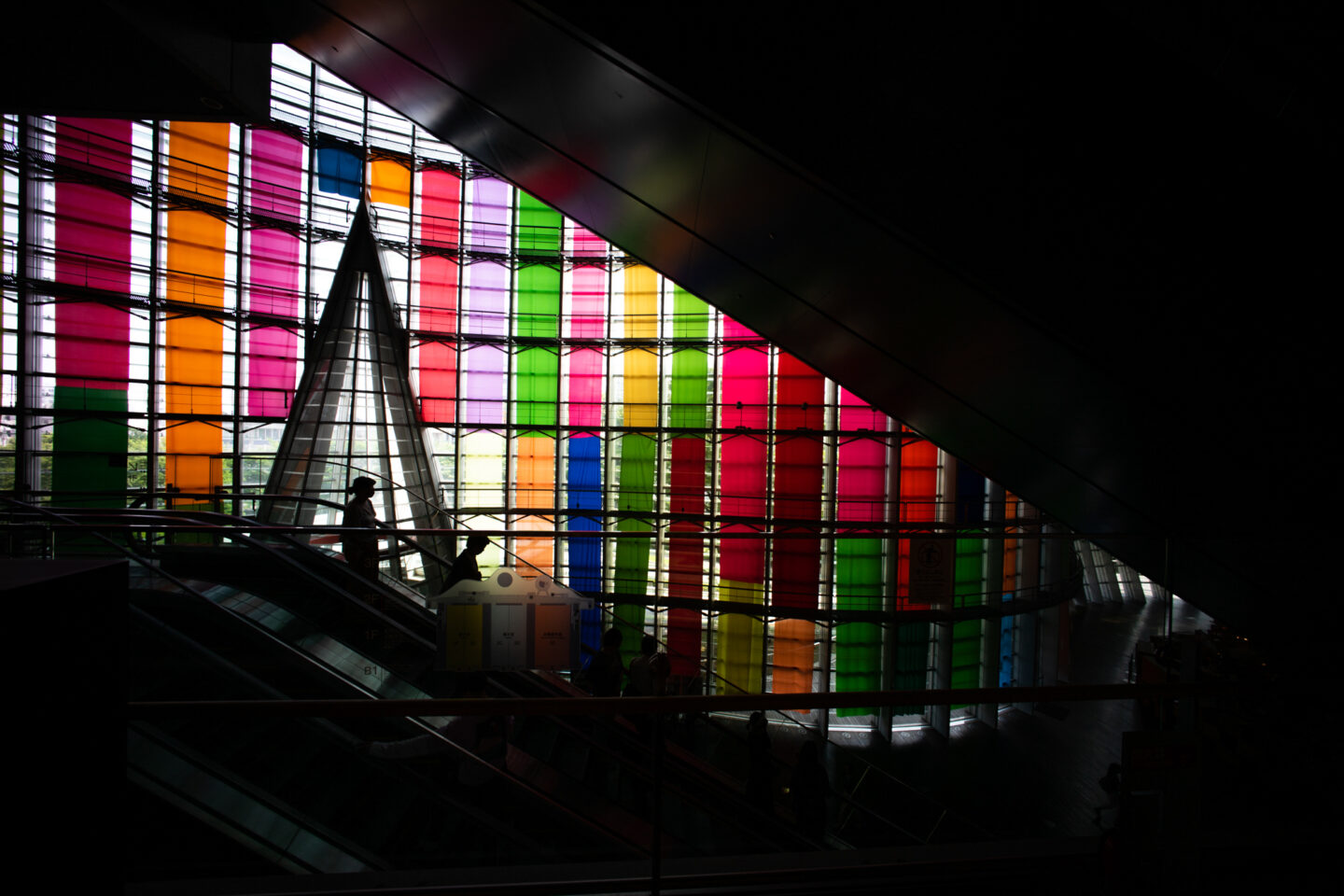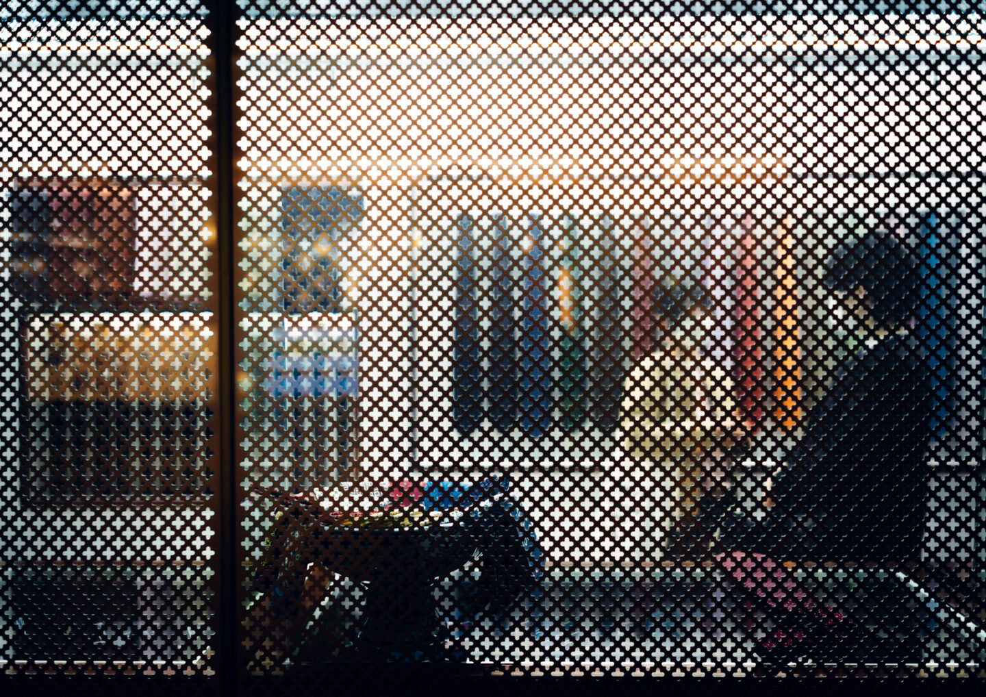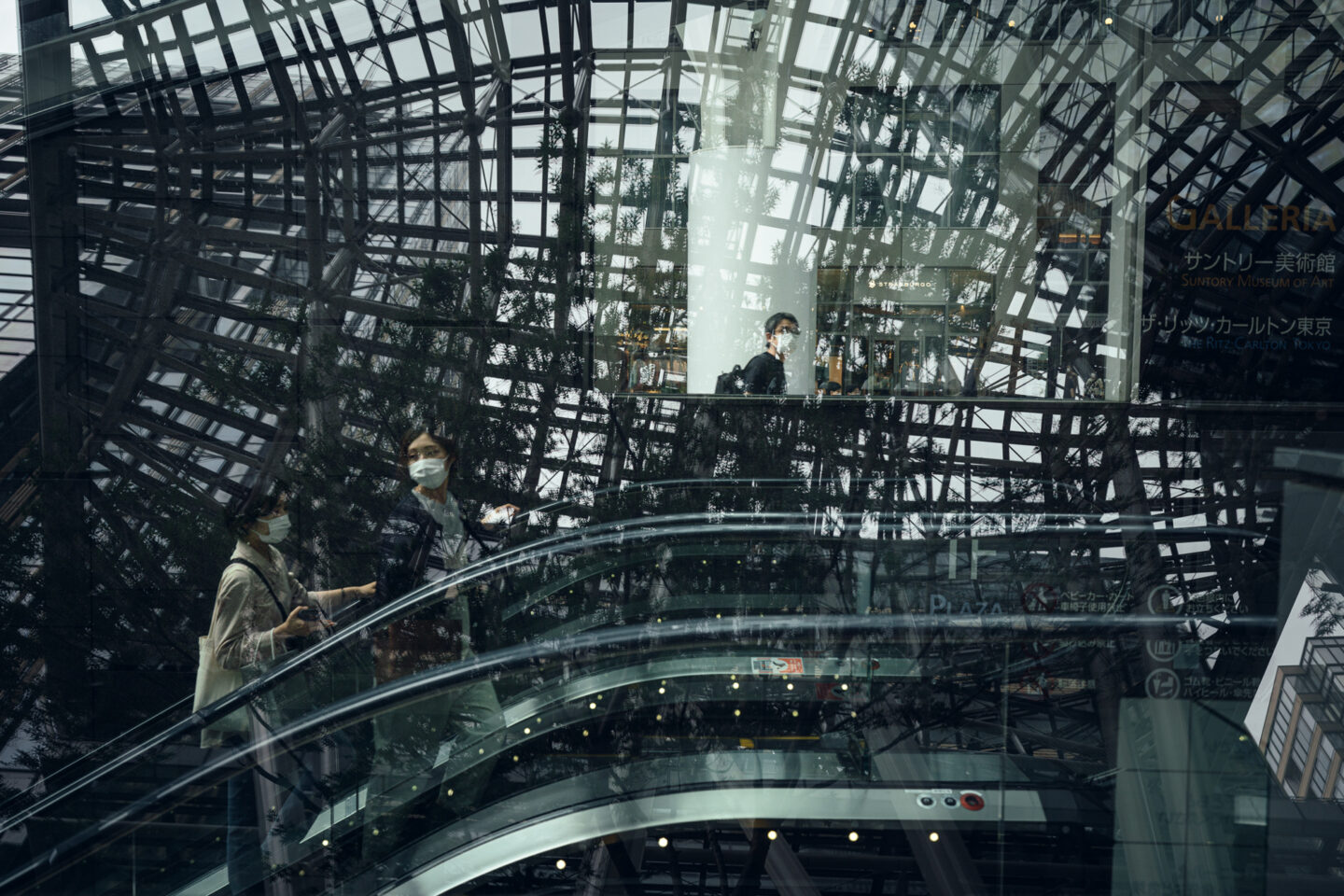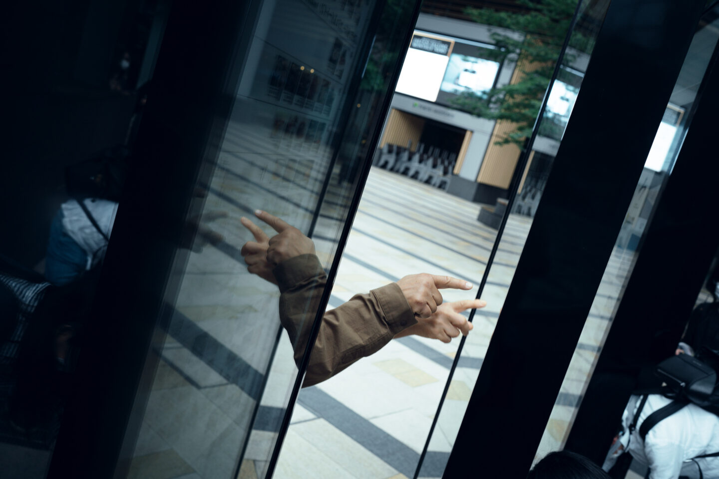 傾いたガラスを通して撮影。屋根が映り込んで複雑な造形になった。その中にぽっかりと白く抜けている場所があったので、そこに行きかう人を入れてみた。全体はごちゃごちゃしているけれど、その中に一つの空間を見つけて人を入れる。カメラの高さの調整でこういった構図を作れることが多いのでやってみよう。