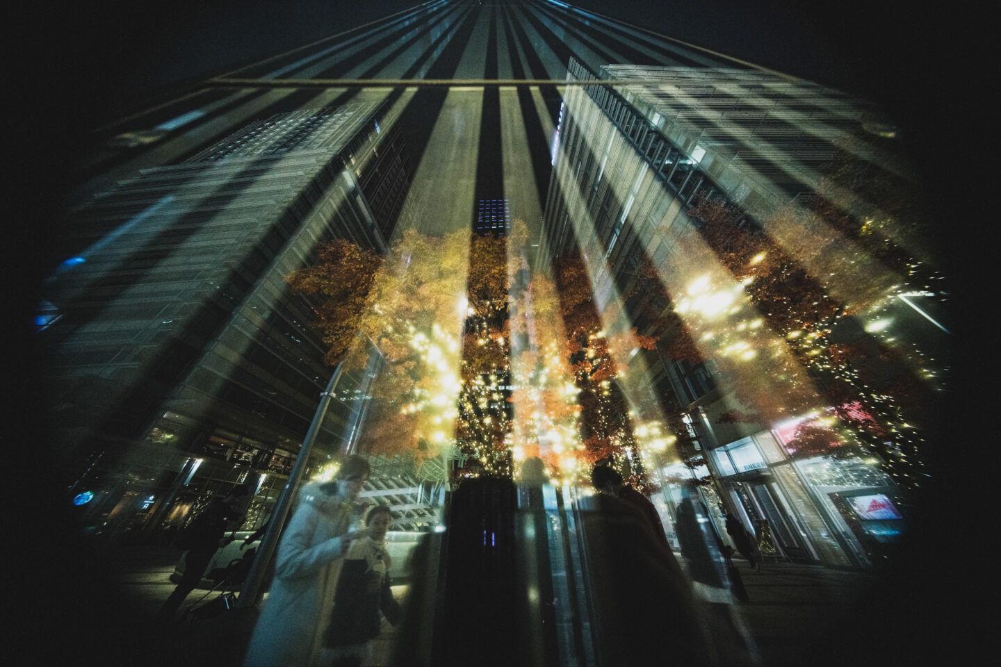 イルミネーションの時期は定番の場所だが、ヘアライン処理されたステンレスの手すりにレンズの下半分を重ねて光を伸ばすテクニックを使っている。皆が一斉に同じ場所へレンズを向けて写真を撮っている場所でも、手前にちょっとした何かを探すと、少し違った写真になってくれる。特に手すりは見落としがちだが、個性を出す一番の被写体だったりするので、探す癖をつけてみよう。