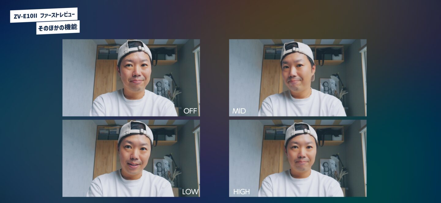 効果の強さもOFF・LOW・MID・HIGHの4段階から選べます。