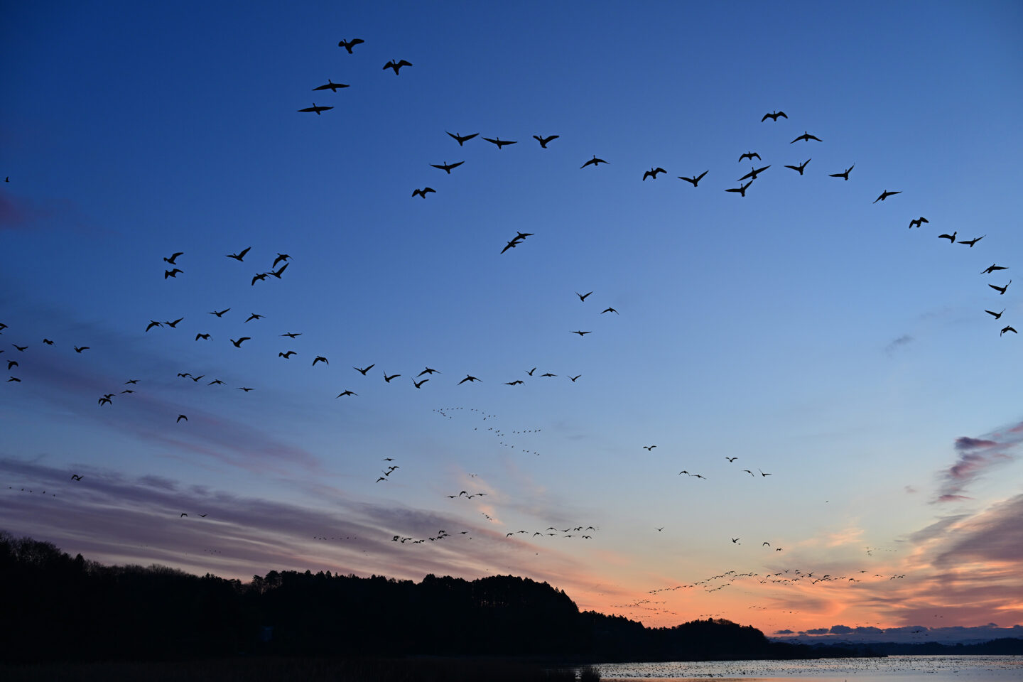 夜明けとともにねぐらを飛び立つマガンの群れ。飛び立ちの時間は毎朝異なり、日の出後のときもあれば日の出前のときもある。日の出後であれば露出は稼げるが、本作例のように日の出前なら露出は厳しいため明るいレンズが重宝する。