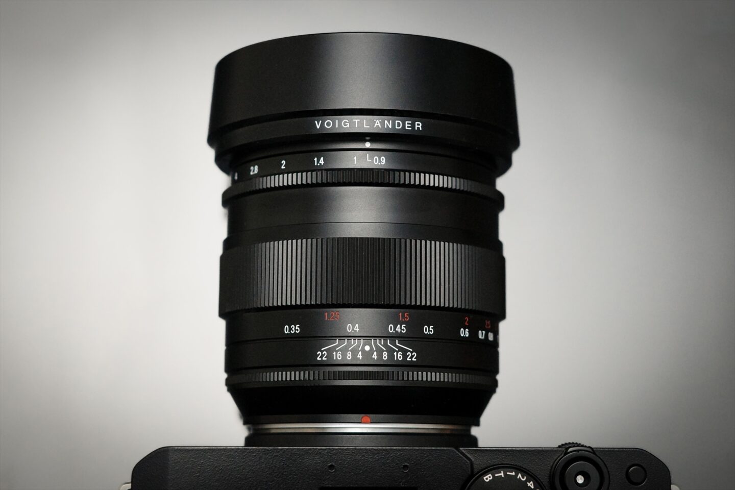絞りリングは1/3段ごとにクリック感があり操作がしやすく、フォーカスリングには適度なトルクの重みを感じます。MFレンズで絞り開放F0.9という非常にシビアなピント合わせを示すかのように、フォーカスリングには最短撮影距離0.35m~0.5mに間隔の広さが見られます。わずか15cmの距離で慎重かつ、緻密なピント合わせとなりますが、EVFをのぞいていると合焦した際に奥行きを感じ、被写体が浮き上がってくる感覚に思わず息をのみます。