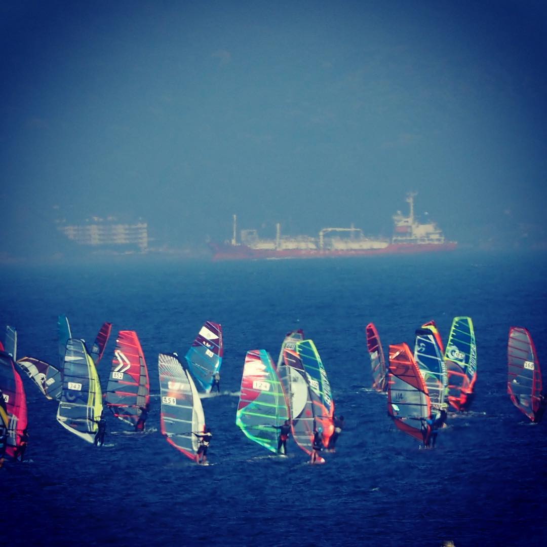 5月に津久井浜で開催された、ANAウインドサーフィンワールドカップ横須賀大会のワンショット。レースは緊張感に溢れていますが、遠くから見る色とりどりのセールがとても綺麗です。