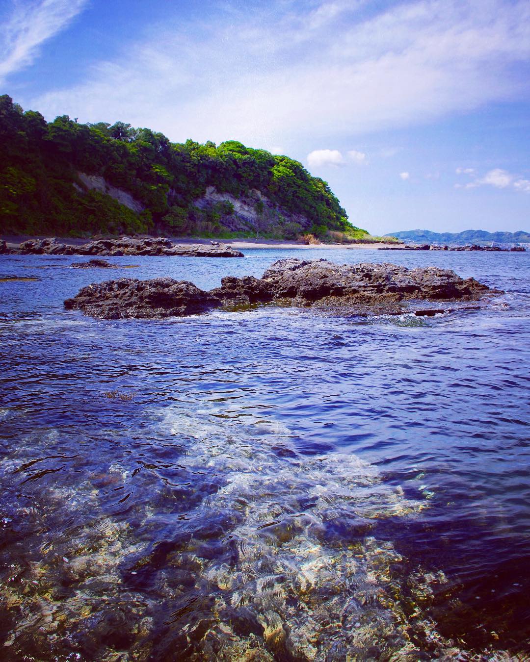 油壺湾での1枚でしょうか。干潮時の岩肌が出ている感じ、水が引いていっている様子など、砂浜とは違う印象に目をひかれました。