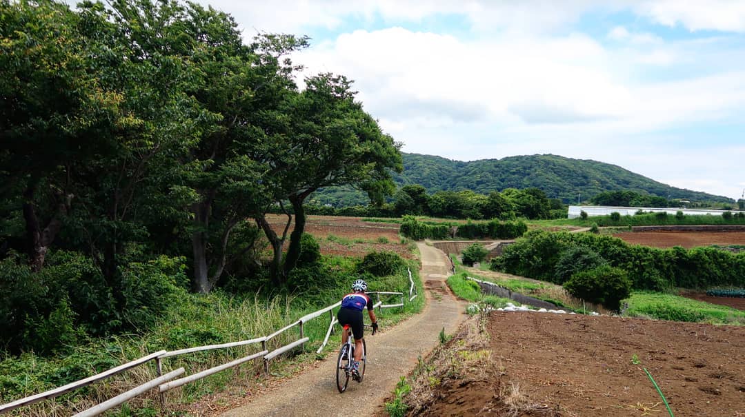 緑と畑と農道のコントラストから伝わる自然の開放感と普段の喧騒から離れ、自転車を楽しむライダーの心地よさが伝わってきて、サイクリングに行きたくなるいい写真ですね。