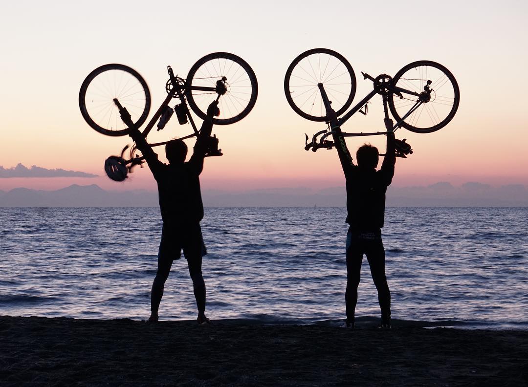 人物と自転車のフレームが重なり、海岸まで自転車をこいで、初日の出をみたお二人の達成感がひしひしと伝わってきました。