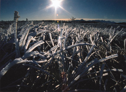 草原に昇る太陽を入れた構図が大胆な、力強い作品です。