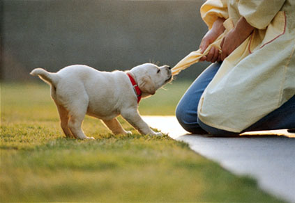 望遠レンズを効果的に使い、やんちゃな子犬のしぐさを上手にとらえています。