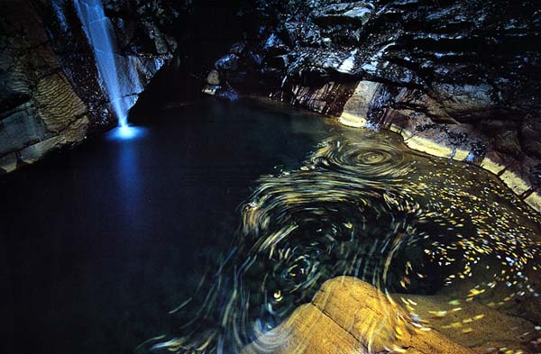 滝壷の空間と落ち葉の色合いや流れが、不思議な渓流の空間を引き出しています。フレーミングが見事です。