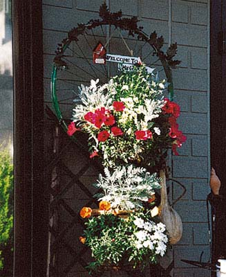 自転車の車輪をペイントして飾ったり、いろんな花を何段かに分けて寄せ植え風にしています。