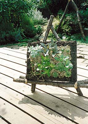枝を組み合わせて作ったイーゼルに飾れば、ガーデンミュージアム?