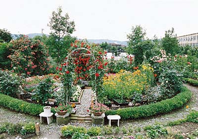 バラを外側全部に植え、各三ヶ所の入り口にはアーチを作り、つるバラを植えています。