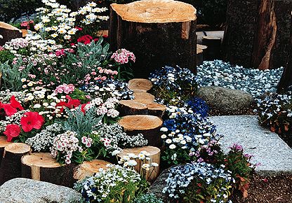 花を生かすにはその背景が大切ですが、切り株 と石を上手に配置して花々を引き立てています。花材の 配色もなかなかのものです。