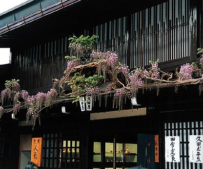 | 食堂の正面を藤蔓で作りあげている構図に感動 しました。この様な植物を使った装飾は一朝一夕に出来 あがるものではありません。構想から何年経ったかはわか りませんが、お客様に対して花を通してその美しさと香り を楽しんでもらおうという主人の努力と感謝の気持ちが 伝わってくる作品です。 |