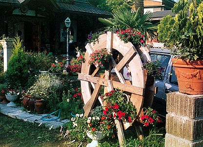 この様な水車の イメージを持ったプランター は絵になります。配置する ところやその背景づくりを 工夫して個性的な素晴らし い庭づくりを期待します。