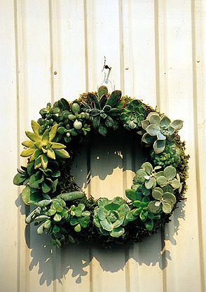 多肉植物を使ったリース。多肉植物 の形の面白さと特性を生かしてもっともっと 利用してほしい花材のーつです.