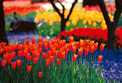 球根植物の魅力は その美しさと派手さを自己 主張する存在感にあります。 このような群をなすと他の どんな花をも寄せ付けない 華麗な春の代表花がこの チューリップです。