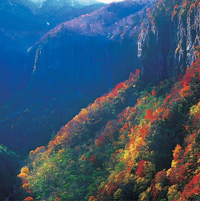 上には雪が、滝のあたりは紅葉がなくなりかけ、下の方は紅葉が盛りになっているという、日本の季節の移行を伝えながら、雄大な風景として捉えています。ライティング、フレーミング、撮影条件、そのすべてが一致した見事な作品です。