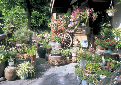 静寂なたたずまいの背景の中に、様々な植物が小道具たちと極自然に語らい、居心地のよさを満喫しているよう見えます。けして個々には美しい植物、小道具たちではないのですが、ここに生活する人の素朴な人柄がこの庭全体に感じられ、物を大切にし、それを生かしながら、ガーデニングを楽しんでいる姿に感動しました。