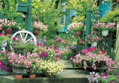 素敵な玄関の門柱ですね。この色を生かした背景の樹木と華やかなペチュニア類の花々。確かに白い車輪は左の、花車が右のポイントになっていますね。柔らかい配色の春らしい玄関前です。