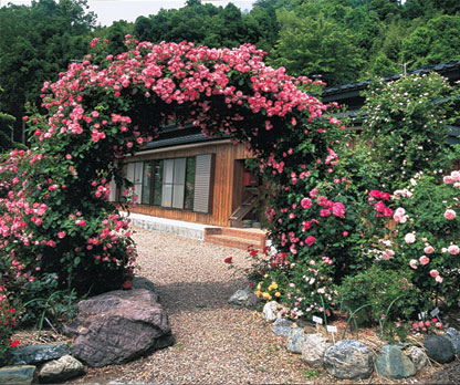来訪者を迎えてくれるこれだけ見事なバラのアーチは多くありません。バラのお好きなお宅なのでしょう。管理消毒に励む姿が目に浮かぶようです。足元を構成する左右不対称の石の配置もいいですね。