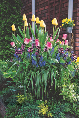 みなぎる春の球根パワーを感じさせる作品です。秋植え球根には他の花材では太刀打ちできない華やかさがあります。コンテナにこれだけ数がまとまると尚更です。このコンテナならばひとつあるなしでその空間が豹変しますね。