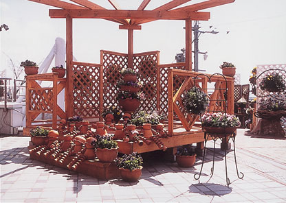 ウッドデッキのデザインにも凝っていますが、飾り付けるコンテナの色を統一しながら、植物もバランスよく飾り付けています。素焼き鉢を使っての人形は作品にオリジナルな個性的要素を付加しています。