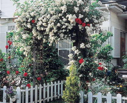 素晴らしい小輪の白バラアーチですね。花は春の一時期ですが、これだけ見事に咲かせる管理の大変さはバラの愛好家ならば誰もが身にしみています。所々に咲く赤のバラが全体を引き締めていますね。