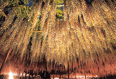 ライトアップされた藤の棚が風で揺れているところを、ワイドレンズで下から撮っています。見事なアングルで、幽幻な感じがよく出ています。