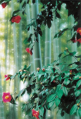 藪椿と竹の緑が掛け軸のような、日本的な構図を作り出しています。ソフトフォーカスで的確な絞りを選び、狙い通りに仕上げた上手な作品です。