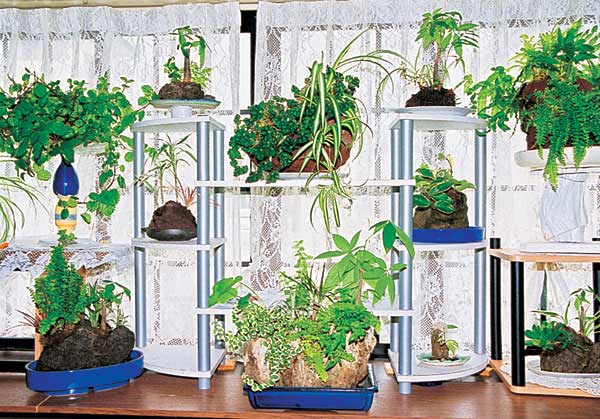 レースのカーテンを背景に苔玉、化土玉作りの観葉植物の作品群でしょうか。ミニ盆栽を飾る違い棚風の棚に、それぞれが居心地よさそうに鎮座していますね。植物が元気に育つ環境の設定と飾り方のセンスが光る作品です。