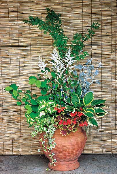 和風のコンテナですが、背景(芯を構成するモミジ、アスチルベ)、中景(白妙菊、ラベンダー、ギボウシ、コリウス、オオデマリ等)、前景(アイビー、モミジ葉ゼラニューム等)の植物のそれぞれの役割を考慮した、配置、色彩感覚がすばらしく、非の打ち所がない美しさにまとまっています。