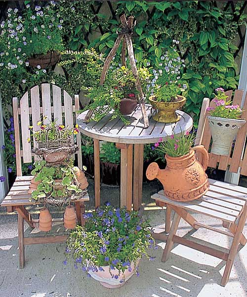 植物の美しさを生かすには背景が大切ですが、この小さなテーブルと椅子にバランスよく飾られたコンテナたちが、それぞれの場所で個性を最大限に発揮しているのは、全体をうまく引き立てている背景に支えられていることを見逃すことはできません。