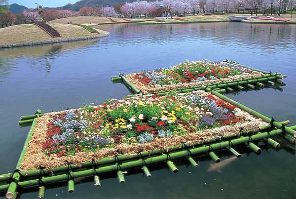 池の中にぽっかり浮かぶ花いかだ。春の水面をにぎやかに変身させてくれます。花の取り合わせも春らしくていいですね。色々なところでもっと真似てほしい飾り方ですね。