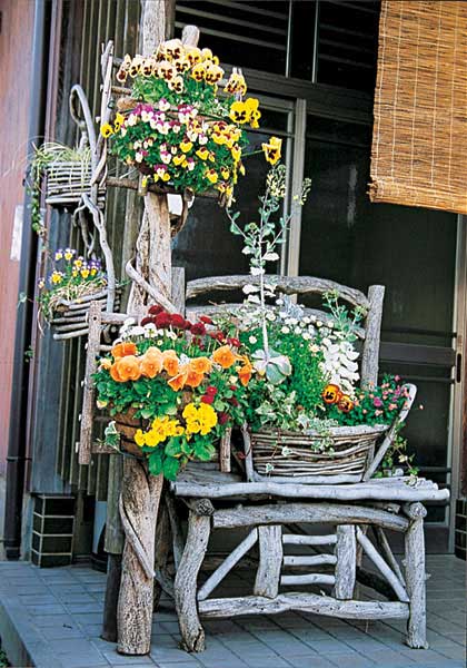 ハンギングやコンテナを飾っている手作りの籐いすのデザインが、植物を引き立て、個性的でいい雰囲気を醸し出しています。全体を自然素材の籐ヅルで統一したことでよい作品が生み出されています。