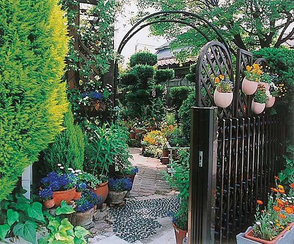 手前にある門のハンギングの掛かったトレリス、白モッコウバラの絡んだトレリス、ツルバラのアーチ、立ち木、遠近のコンテナ類の配置バランスの妙が成せる技です。