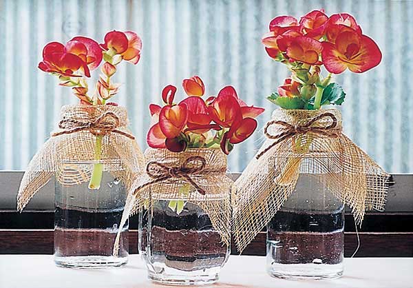 植物の色や器の大きさに合わせて麻布を切り、瓶にかわいらしく巻き付けるだけで器の価値が格段に上がります。器の高さもリズム的に異なっているのがいいですね。