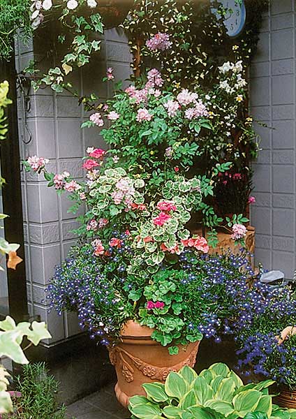 大鉢のコンテナにボリュームいっぱいに咲き乱れています。中央の斑入りのゼラニュームが花にも勝るとも劣らない効果を演出しています。ロベリアのブルーの反対色が全体を引き締めています。