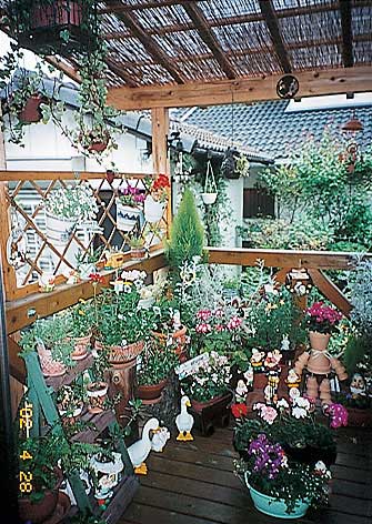 ベランダが真夏の強光から保護され、ハンギング装飾用に加工された空間の中で、植物たちも居心地のよい環境に満足しています。高低さが色々工夫され、それぞれ個性的な衣装をまとった植物たちの顔がよく見えます。小道具の人形たちの語らいも楽しそうですね。
