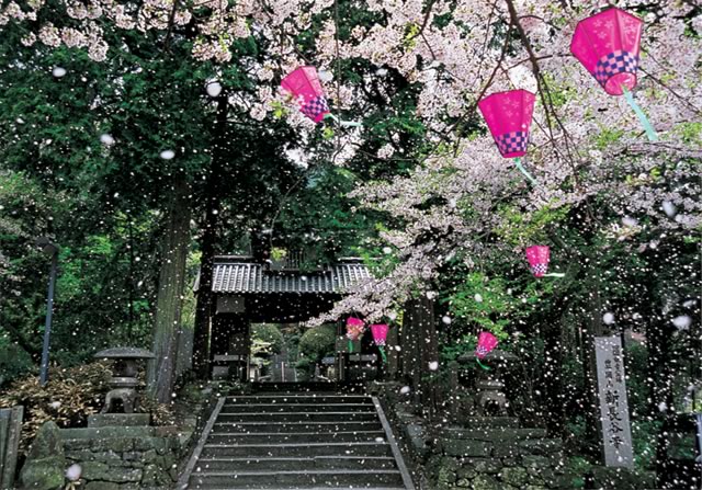 「桜吹雪の山門」