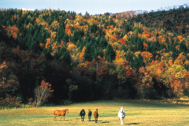 放されている競争馬がカメラに向かって走ってくる。その躍動感のある馬の姿と紅葉の山腹がきれいなフレーミングで切り取られているのが実に素晴らしい。様々な色が織りなす色合いが美しく、とてもすがすがしく感じる。