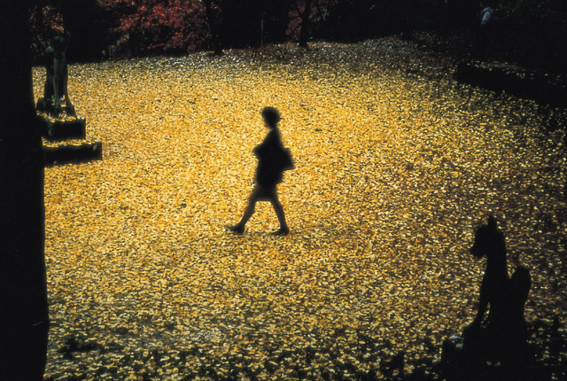 イチョウの葉が神社の境内に舞い降りた後を歩く人物を低速シャッターでブラして撮影。非常に心象的な写真にしている。構図も、対角線にきつねの石像、中央にシルエットの人物と、なかなかのテクニックでとらえている。