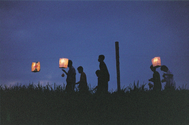 盆踊りに急ぐ人々をシルエットでとらえて、日本の夏の風情を非常に情感をもって伝えている。全体にダークブルーの色調の中に、この万燈が印象的な輝きを放ち、写真でなければ、出せない、味わいを醸し出している。