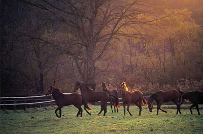 逆光気味の美しいライティングで、馬の存在感が表現されています。秋風がこの牧場にそよいでいることが伝わってきます。
