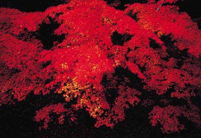 黒いバックの中で美しく輝くモミジを、印象的なローキートーンの画面でとらえたことで、特徴的な表現が成功しました。