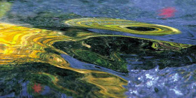 渓流の水に反映する岸辺の紅葉の色合いをとらえて、美しい造形模様を引き出しました。パノラマサイズにしたことは、的確な判断でした。