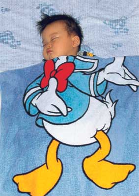 赤ちゃんとタオルのイラストとの大きさがぴったりで、本当に動き出しそうな雰囲気が表現されています。静かな世界なのに動きが感じられる作品です。