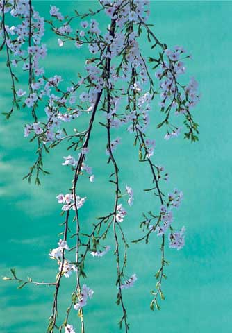 エメラルドグリーンの水面を少し明るめにして、縦位置の構図で切り取ったことで着物の柄のようにも見えます。